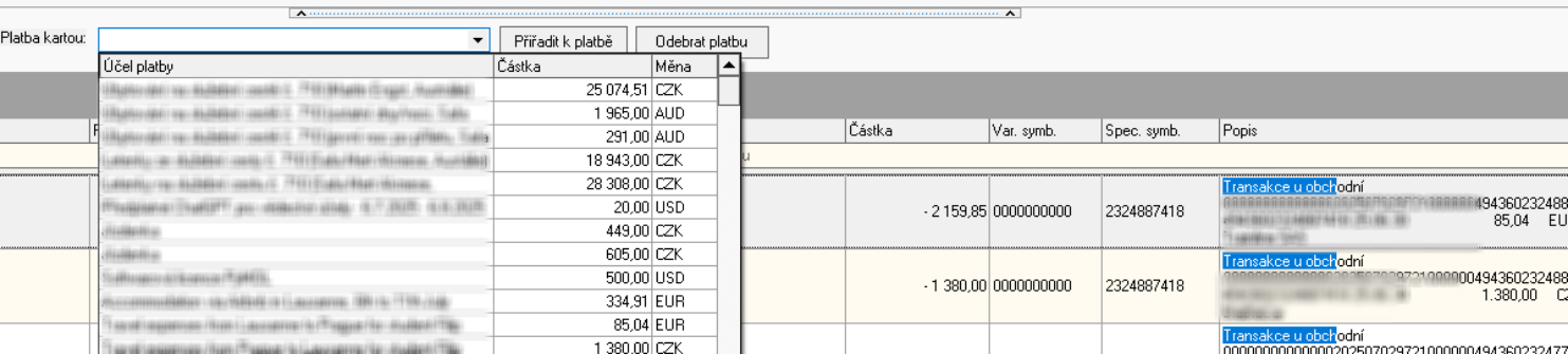 Propojení je možné u položek obsahujících v popisu text "Transakce u obchod" a zároveň ve specifickém symbolu v posledních čtyřech číslicích poslední čtyři číslice z čísla platební karty.