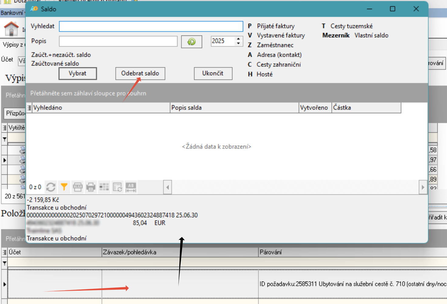 Při zrušení se postupuje stejně jako u párování, jen se použije tlačítko Odebrat saldo