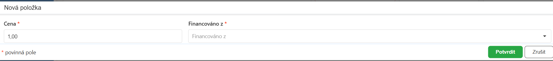 Musí být vyplněno z jakého grantu bude platba financována. Částka může být rozdělena na několik grantů (v tom případě stačí kliknout na +Přidat položku a vyplnit detaily).