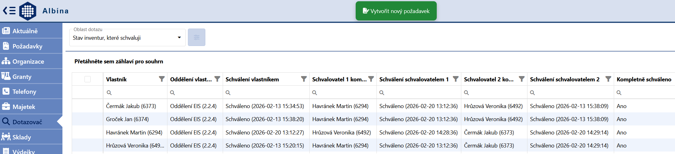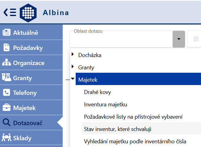 Každý zaměstnanec, který schvaluje inventuru (ať už jako vlastník nebo jako člen komise), si může aktuální stav inventury zobrazit v Albíně v nabídce: Dotazovač › Majetek › Stav inventur, které schvaluji.