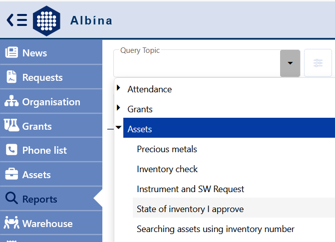 Each employee who approves an inventory (either as the owner or as a committee member) can view the current status of the inventory in Albína under: Reports › Assets › Status of Inventory I Approve.