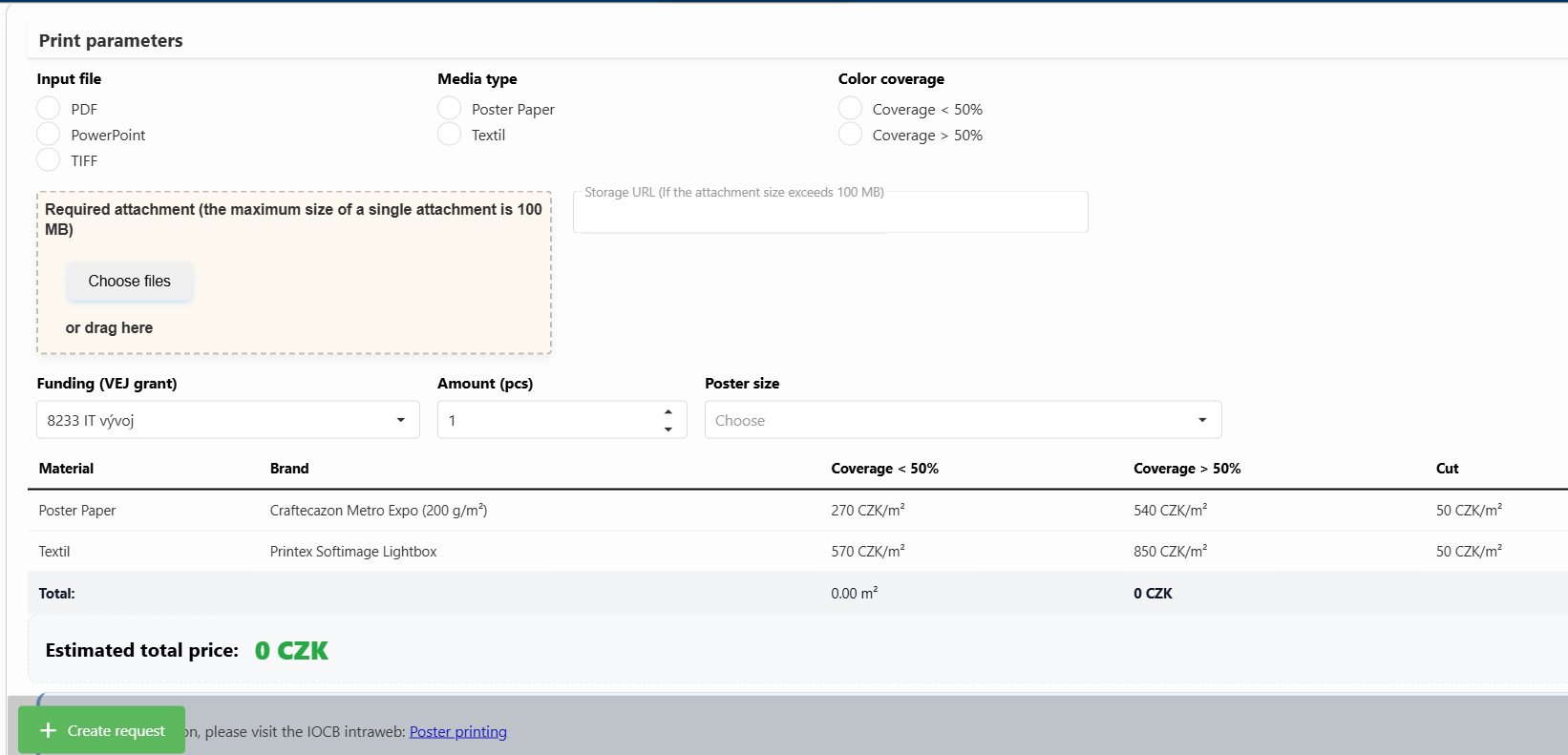 It is now possible to order poster printing via the Albína system on the HP Latex 315 plotter within the ITS department. After submission for approval, the request is first reviewed and, if necessary, adjusted by the IT staff member responsible for reprographics; it is then forwarded to the department head for final approval.